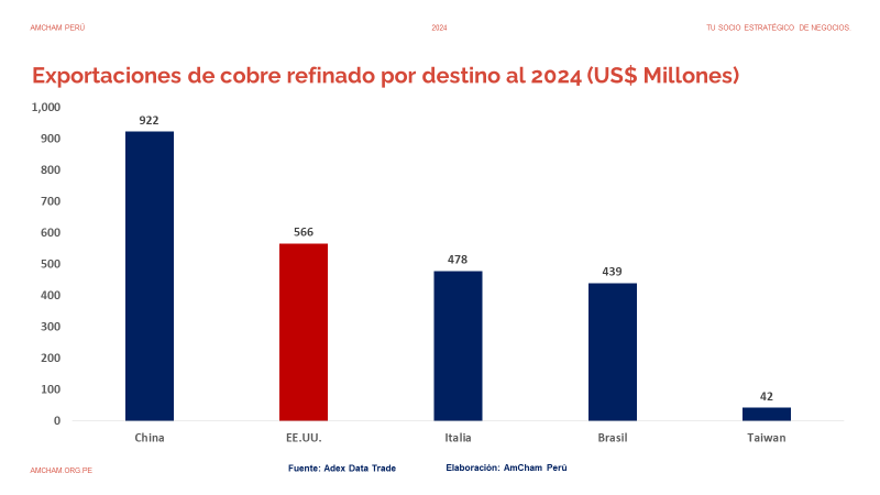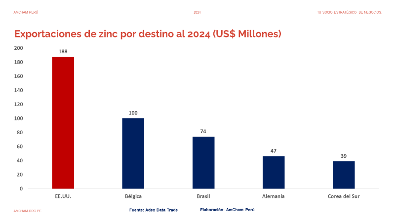 Las exportaciones mineras a Estados Unidos llegaron a los US$2,131 millones al cierre del 2024, lo que representa tan solo 5% del total y ubica a la primera economía del mundo como el sexto mercado más importante para nuestros productos mineros. Si bien a niveles generales el resultado no es tan destacable, la importancia aumenta para algunos bienes específicos.