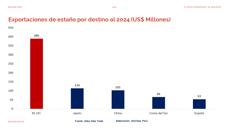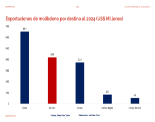 En ese sentido, el país norteamericano destaca como el principal destino para bienes mineros como el estaño o el zinc, por encima de otros socios comerciales como Bélgica, China o Japón. Estados Unidos también destaca como el segundo mercado más importante para las exportaciones de cobre refinado y molibdeno, solo por detrás de China y Chile; respectivamente (Ver gráficos).