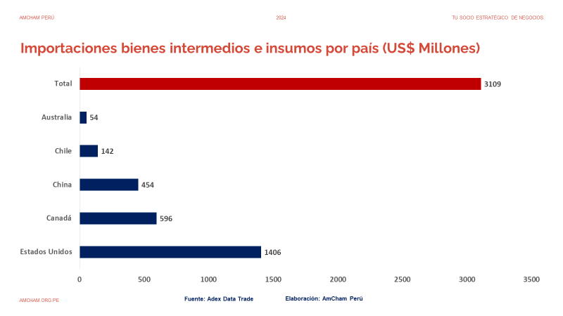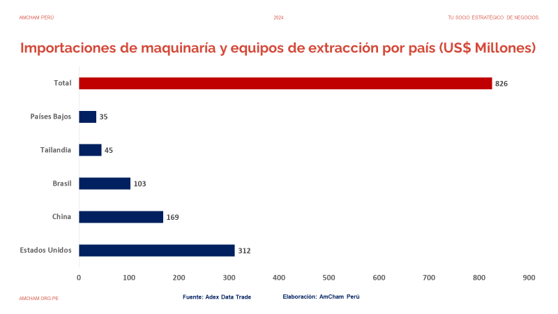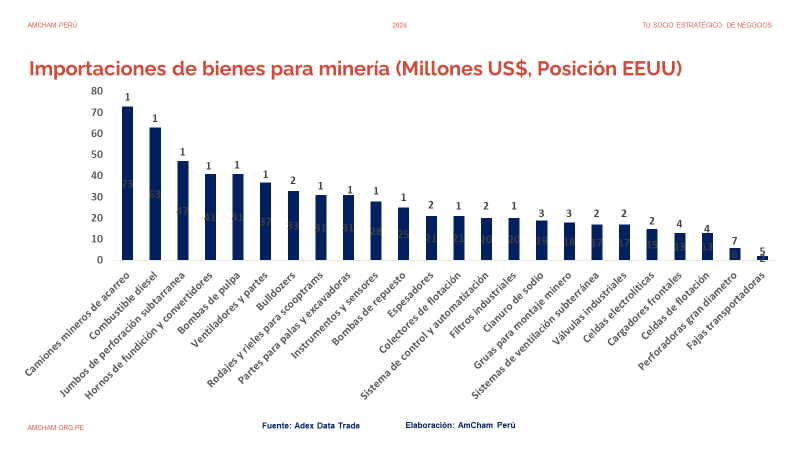 Más allá de su importancia como destino, Estados Unidos ha sido uno de los principales proveedores de bienes necesarios para poder impulsar el sector minero. Por ejemplo, en términos de maquinaria y equipo para la extracción en operaciones mineras o de bienes intermedios e insumos críticos, la primera economía del mundo destaca como el principal proveedor. La relevancia aumenta para algunos bienes específicos (Ver gráfico).