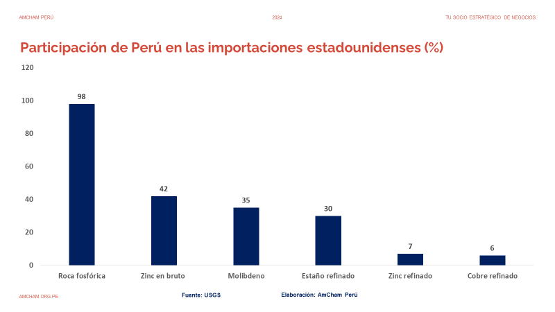 Las exportaciones peruanas de esos productos a Estados Unidos se deberían mantener en el mediano plazo dado nuestro rol como proveedor. Según información del Servicio Geológico de Estados Unidos (USGS, por sus siglas en inglés), Perú llega a representar hasta el 98% de las importaciones estadounidenses de roca fosfórica mientras que en otros bienes como el zinc o molibdeno, la relevancia no baja de 30% (Ver gráfico).